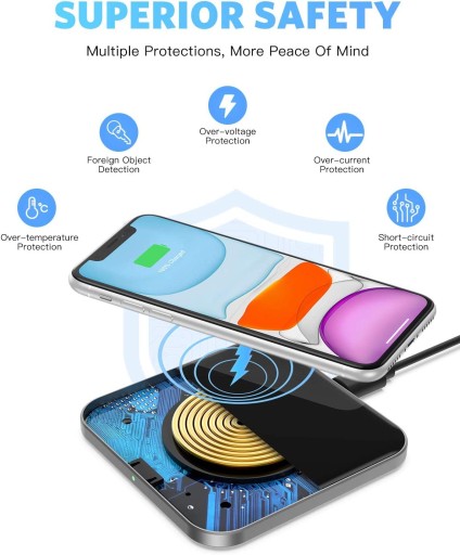 Wiele trybów ładowania - Szybka ładowarka do telefonu oferuje 4 tryby ładowania, odpowiednie do funkcji ładowania bezprzewodowego dla telefonów komórkowych 15 W / 10 W / 7,5 W / 5 W. Dzięki wbudowanej mocnej cewce ładującej szybkość ładowania wzrasta o 40%, a współczynnik konwersji może wynosić do 80%.
