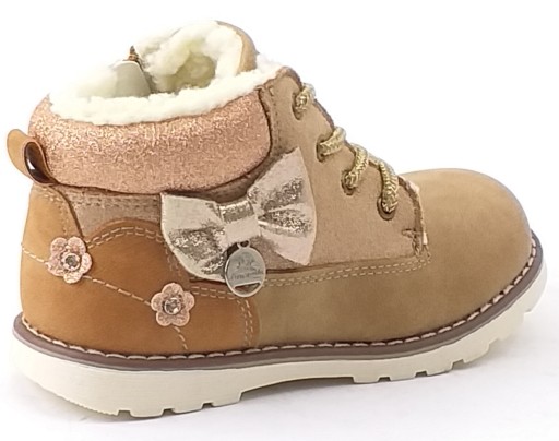 TRZEWIKI FIRMY WOJTYŁKO HIT TEGO SEZONU - dziecięce buty - Wojtyłko ocieplane. Wykonane są z wysokogatunkowej skóry ekologicznej w strukturze przypominającej nubuk. Wnętrze bucika wraz z wkładką obszyte cieplutkim, grubym kożuszkiem. Śliczna ozdoba w postaci kokardki i kwiatków.