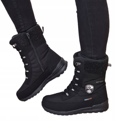 Śniegowce o sportowym fasonie, sznurowane. Osadzone na grubej, płaskiej podeszwie, z zaokrąglonym noskiem. Wodoodporne. Wykonane z materiału o technologii Softshell. Mocno ocieplane. Sugerujemy wybór rozmiaru wedlug długości wkładki. Obuwie posiada technologie Softshell oraz TripleTex. Ten ciepły model doskonale zharmonizuje się z kurtką parką lub puchówką.
