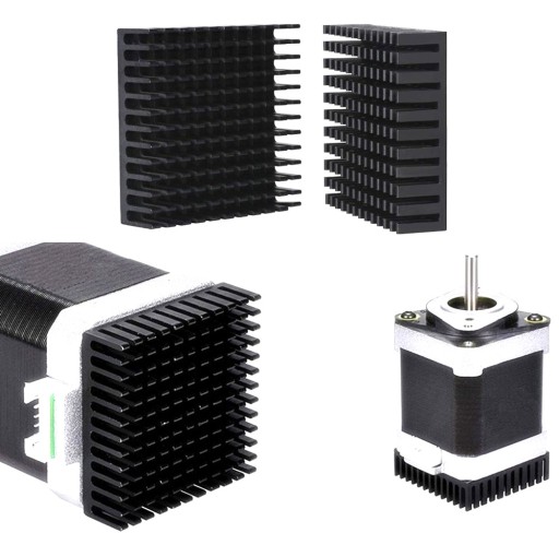 Radiatory aluminiowe (barwione na czarny mat) dedykowane do chłodzenia silników krokowych w drukarkach 3D, układach scalonych płyt komputerowych i nie tylko.