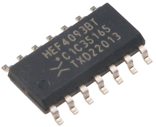 Układ HEF4093BT. 4 dwuwejściowe bramki NAND Schmitt. Obudowa: SMD, SO14.