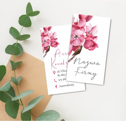 Piękne wizytówki dwustronne z motywem kwiatowym w roli głównej.
