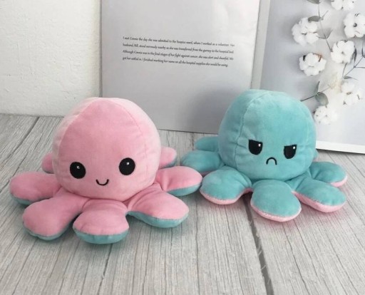 Maskotka pluszowa ośmiornica to nieustający bestseller! Oferowany na naszej aukcji pluszak ma kształt ośmiornicy, a cały jego fenomen polega na tym, że jest dwustronny! Jak to działa? Z jednej strony maskotka ośmiornica jest wesoła i ma uśmiechniętą buźkę, a po przewróceniu na drugą stronę jest smutna. Dzięki temu dziecko może pokazywać swój nastrój i emocje. W ostatnim czasie pluszak jest również bardzo popularny wśród dorosłych. Po ciężkim dniu w pracy, nasza druga połówka również może w delikatny sposób pokazać nam w jakim jest aktualnie nastroju.Nasza ośmiornica uszyta jest z delikatnego, przyjemnego w dotyku wysokogatunkowego pluszu, jest dwustronna o dwóch różnych kolorach z obydwu stron.