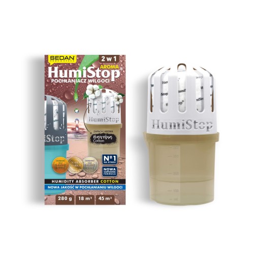 Nowy pochłaniacz wilgoci HumiStop Aroma to wysokiej jakości urządzenie, które doskonale radzi sobie z nadmiarem wilgoci w pomieszczeniach do 18 m? oraz dodatkowo nadaje dyskretny, lecz wyczuwalny zapach bawełny.