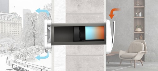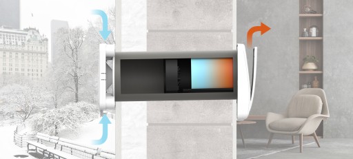 - Wyciszony rewersyjny wentylator zlokalizowany za wymiennikiem, wewnątrz ściany.