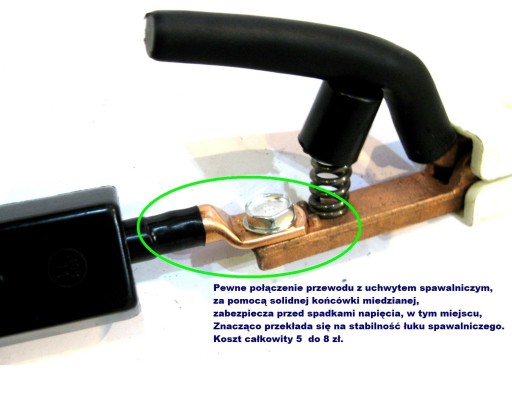 Na szczególną uwagę w naszych przewodach zasługuje, solidne połączenie przewodu z uchwytem elektrody (patrz foto poniżej). Na końcu przewodu, przy połączeniu z uchwytem, zaciskamy prasą hydrauliczną, grube solidne końcówki miedziane, co przy minimalnych kosztach (około 5-8 zł) zabezpiecza cały przewód przed spadkami napięcia w tym newralgicznym miejscu i gwarantuje jego skuteczne działanie. Dzięki temu rozwiązaniu oraz zastosowaniu polskiego, grubego, miedzianego przewodu o wysokiej elastyczności, nawet przy dużych prądach i długim czasie spawania, przewód nie nagrzewa się, spawanie jest stabilne.