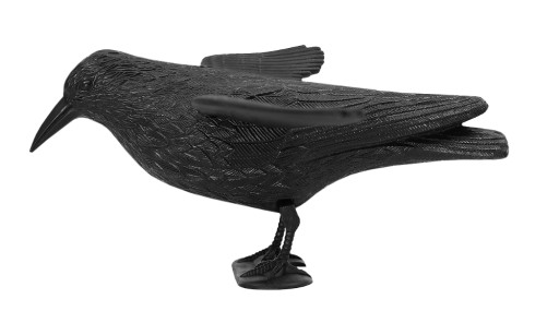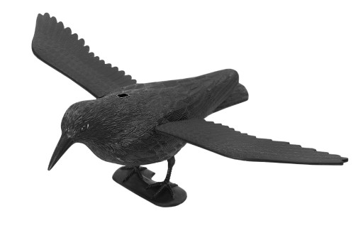 ✅ Sztuczny kruk o realistycznym wyglądzie i rozmiarze, pełniący rolę odstraszacza ptaków (gołębi, szpaków itp.) żerujących na działce lub w ogrodzie.