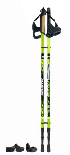 Wysokiej jakości, lekkie, aluminiowe, dwuczęściowe, składane kijki Nordic Walking marki Allright. Posiadają system amortyzujący wstrząsy - ANTI-SHOCK oraz możliwość jego wyłączenia. Posiadają specjalne rączki z paskiem-rękawiczką, które umożliwiają pewne trzymanie kijów podczas chodzenia. Rączki są wyprofilowane, aby zapewnić komfortowy chwyt i redukować obciążenie stawów. Dodatkowo pokryte one zostały warstwą naturalnego korka. W komplecie znajduje się zestaw nasadek.