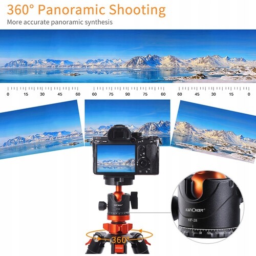 Duża metalowa głowica kulowa KF-28 o średnicy 28 mm zapewnia nośność 10 kg, można ją obracać o 360 stopni, zapewniając płynne, stabilne nagranie / obraz podczas fotografowania panoramicznego lub nagrywania wideo