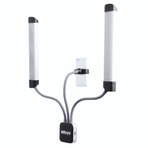 ✅ Każdy z paneli posiada aluminiową obudowę, wewnątrz której znajduje się aż 112 diod LED SMD, emitujących wyjątkowo silny strumień świetlny. Zintegrowany dyfuzor atrakcyjnie rozprasza i zmiękcza światło, niwelując w pewnym stopniu ostre, wyraźne cienie. Obsługa lampy jest bardzo prosta – regulacja mocy i temperatury barwowej odbywa się za pomocą jednego pokrętła z przyciskiem funkcyjnym, nad którym umiejscowiono niewielki ekran wyświetlający aktualnie dostosowywane parametry. W obudowie lampy umieszczono także standardowe wejście USB, dzięki któremu istnieje możliwość ładowania smartfona w trakcie pracy. Do zestawu dołączono dedykowany uchwyt na telefon i giętkie ramię do zamocowania go – to praktyczne rozwiązanie, które pozwoli na nagrywanie filmów smartfonem w trakcie pracy z lampą.