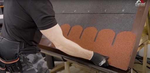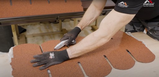 Gonty należy mocować do podłoża za pomocą gwoździ papowych. Jako warstwę podkładową należy zastosować papę MATIZOL SOLID PV/64 lub MATIZOL EXPERT W/PV- SBS lub MATIZOL EXPERT W/PV- SUPER SBS. Nie stosować papy na tekturze. Układanie gontów asfaltowych na dachu powinno się odbywać w temperaturze powyżej 10°C. Temperatura optymalna to +15°C do 25°C. Montaż nie może odbywać się podczas opadów atmosferycznych. Gdyby prace montażowe zostały przerwane przez opady deszczu, dalsze prace mogą być kontynuowane po dokładnym osuszeniu podłoża. Jeżeli montaż gontów odbywa się w okresie jesienno – wiosennym (październik - marzec) lub w strefach działania silnych wiatrów i w miejscach mało nasłonecznionych oraz na dachach o nachyleniu powyżej 60° wymagane jest punktowe podklejenie nosków gontów klejem do gontów MATIZOL Shingle Flex. Klej aplikować plackami o średnicy ok. 1cm 3-5cm powyżej wycięcia międzymodułowego, a następnie docisnąć. Temperatura podłoża powinna wynosić +5°C do +35°C. Jeżeli w ciągu miesiąca od chwili montażu gotów nie nastąpi ich sklejenie, należy również dokonać podklejenia nosków, ponieważ oznacza to, że warunki atmosferyczne (wiatry, nasłonecznienie, itp.) nie pozwalają na samoistne sklejenie się gontów. W okresie upałów nie należy wynosić wszystkich gontów na dach, ponieważ ich nadmierne nagrzanie może być przyczyną trudniejszego oddzielania folii zabezpieczającej spodnią ich powierzchnię, którą przed montażem należy bezwzględnie usunąć. Nie usuwać paska folii z górnej krawędzi spodniej strony gonta. Nie należy używać gontów o różnych oznaczeniach partii na tej samej połaci dachu. Różnice odcieni barwy występujące na gontach są naturalną cechą tego typu pokrycia i nie są wadą. Dla zminimalizowania ewentualnej różnicy odcieni barwy, gonty w czasie układania powinny być pobierane na przemian z różnych paczek.