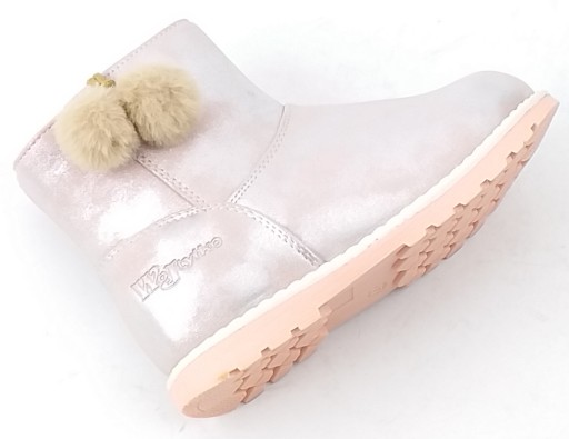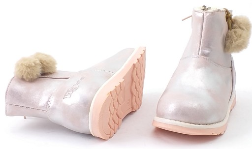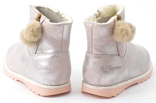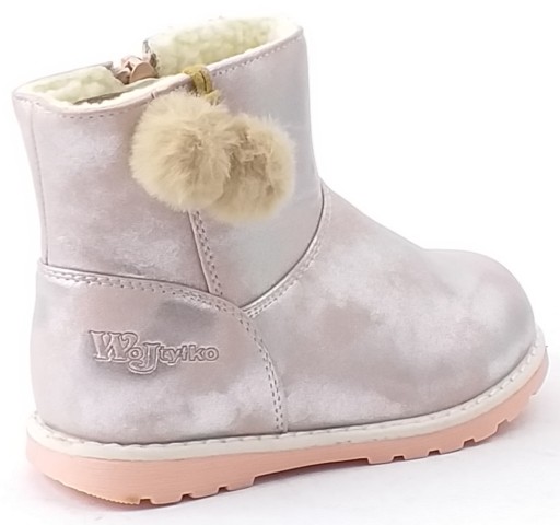 TRZEWIKI FIRMY WOJTYŁKO HIT TEGO SEZONU - dziecięce buty - Wojtyłko ocieplane. Wykonane są z wysokogatunkowej skóry ekologicznej w strukturze przypominającej nubuk. Wnętrze bucika wraz z wkładką obszyte cieplutkim, grubym kożuszkiem. Śliczna ozdoba w postaci pomponików.