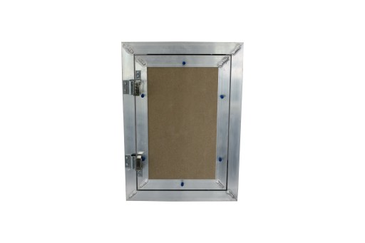 Aluminiowe drzwiczki rewizyjne Plastline 30 cm x 60 cm z możliwością wklejenia płytki ceramicznej wyposażone w wodoodporną płytę G-K i stałe zawiasy.
