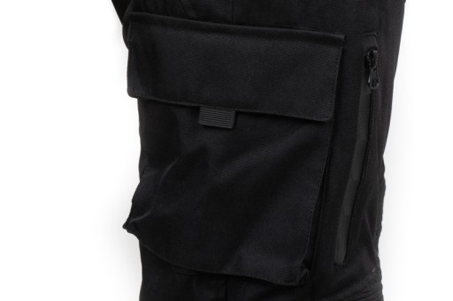 Spodnie posiadają także cztery zewnętrzne kieszenie (dwie standardowe, u góry, z mocnymi rzepami zapobiegającymi wypadnięciu większych przedmiotów oraz dwie typu cargo, z boku ud, które dzięki mocnym rzepom oraz podwójnym zakładkom zapewniają dobrą ochronę przed deszczem.