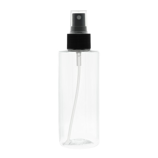Butelka z tworzywa PET z atomizerem o pojemności 150 ml, do kosmetyków lub płynu czyszczącego, odporna na alkohol. Dzięki niewielkim wymiarom można ja nosić przy sobie lub trzymać pod ręką w samochodzie.