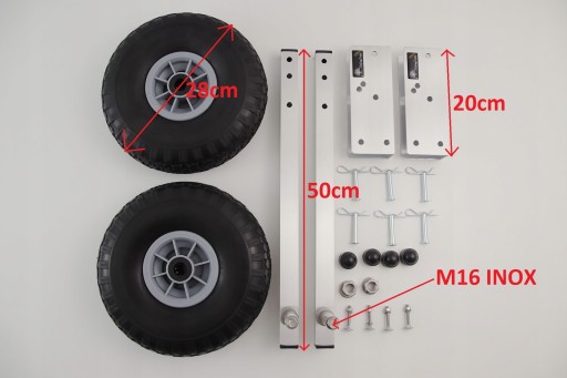 - wysokość koła z przedłużką - 58 cm (w razie potrzeby można skrócić ramię, przy użyciu piłki do metalu lub szlifierki kątowej (przy zachowaniu zasad BHP) a następnie wywiercić nowy otwór fi 16 na oś koła. Skracamy zawsze od strony koła)