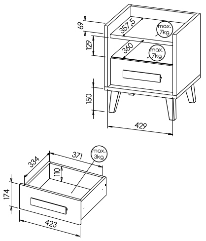 Werso_W11 – 47,3 x 57,2 x 42 – stolik niezbędny element do kompletu z łóżkiem, posiada prostokątny blat, wnękę otwartą do przechowywania, oraz szufladę o wymiarach 42 x 17 x 35.