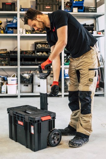 Modularna skrzynia narzędziowa będąca mobilną podstawą do budowy spersonalizowanych zestawów TWO. Solidna teleskopowa rączka, metalowa oś, duże koła pokryte gumą gwarantują wytrzymałość i doskonałą zwrotność.