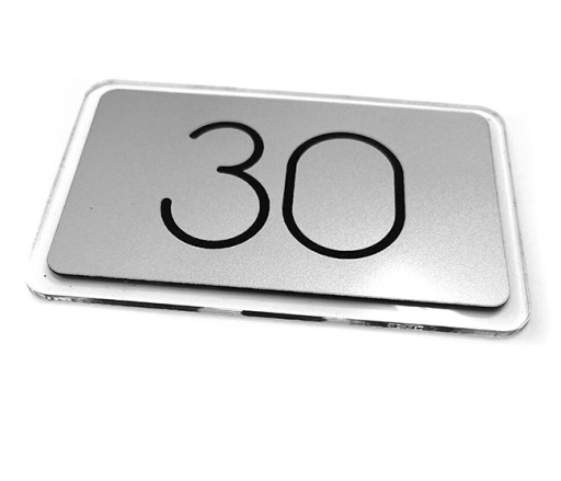 Tabliczkę wykonujemy metodą grawerowania i cięcia laserowego oraz podklejamy wytrzymałą, samoprzylepną taśmą dwustronną. Tutaj tabliczka z laminatu SREBRO SATYNOWE oraz błyszczącej TRANSPARENTNEJ plexi.