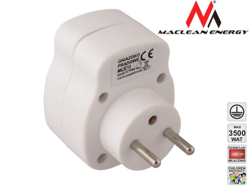 Gniazdko prądowe z wyłącznikiem renomowanej firmy Maclean Energy model MCE13 Przełącznik gniazdkowy jest prostym, ale bardzo użytecznym urządzeniem pozwalającym sterować włączaniem i wyłączaniem dowolnego urządzenia zasilanego elektrycznie, które zostanie do niego podłączone. Umieść przełącznik do gniazdka elektrycznego, a następnie podłącz do niego urządzenie, którego włączaniem i wyłączaniem chcesz sterować.