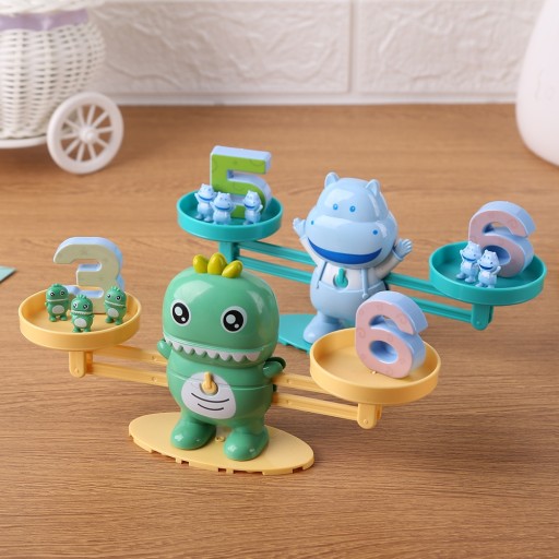To przepustka do dalszej gry! Na jednej szalce kładziemy taka liczbę dinusiów jak wskazuje nam wynik, a na drugiej szalce liczbę tzn. wynik.