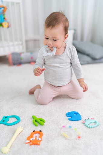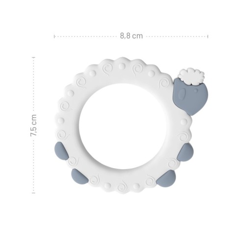 Wykonany z bezpiecznego silikonu gryzak w kształcie owieczki będzie wspaniałym prezentem dla ząbkującego bobasa. Zróżnicowane faktury masują dziąsła ząbkującego dziecka, przynosząc mu ulgę, a wygodny otwór ułatwia małym rączkom chwytanie zabawki.