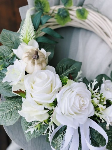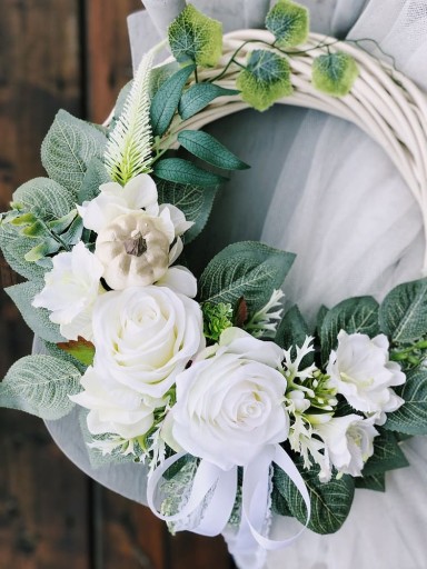 Wianek jesienny, ozdobiony sztucznymi kwiatami róż, frezji, hortensji oraz liśćmi i różnorodnymi dodatkami.