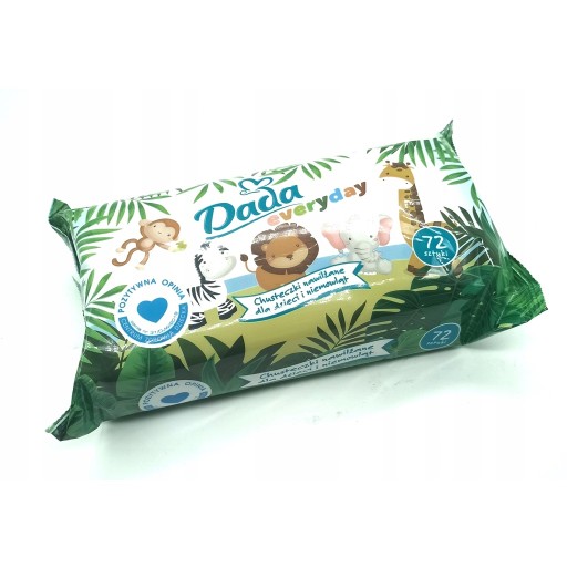 Chusteczki nawilżane Dada Everyday przeznaczone do codziennej pielęgnacji skóry dzieci i niemowląt pakowane po 72 chusteczki w opakowaniu. Chusteczki zawierają delikatne substancje myjące, ekstrakt z rumianku, alantoinę, oraz formułę lotionu nawilżającego, który koi skórę dziecka. Produkt jest bezpieczny, opracowany aby zminimalizować ryzyko wystąpienia alergii, jego działanie zostało potwierdzone w badaniach dermatologicznych (brak reakcji alergicznych w grupie badanych osób). Ponadto chusteczki są miękkie, delikatne, odporne na rozrywanie, posiadają neutralny dla skóry odczyn pH. Wygodny system wyciągania chusteczek jedna za drugą ułatwia użytkowanie. Chusteczki nie zawierają surowców pochodzenia zwierzęcego.
