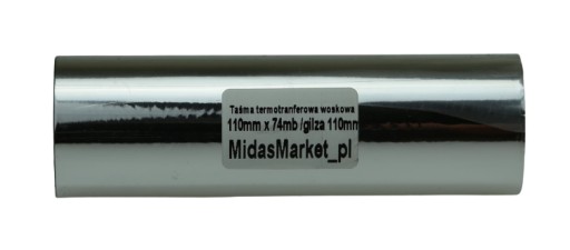 Czarna taśma TTR (Thermal Transfer Ribbon)/kalka/folia termotransferowa WOSKOWA o szerokości 110mm i długości 74mb nawinięta na gilzę/rolkę o średnicy 1/2" (13mm) i długości 110mm.