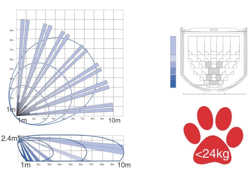 - Technologia dualna poprawia niezawodność czujek, gdyż do wyzwolenia alarmu konieczne jest jednoczesne uruchomienie czujników PIR oraz mikrofalowych.