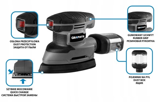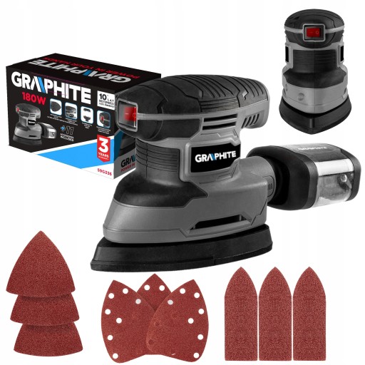 Szlifierka oscylacyjna delta 180 W, stopa 140 x 140 x 80 mm 59G336 GRAPHITE to narzędzie do wygładzania oraz polerowania powierzchni na sucho, szczególnie w trudno dostępnych miejscach, takich jak kąty szuflad. Kompatybilne do obróbki i oczyszczania powierzchni o zróżnicowanej twardości oraz strukturze.