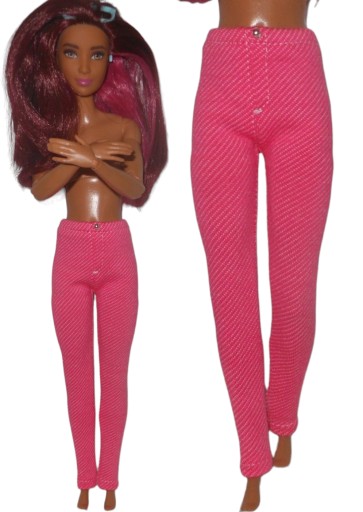 Przedmiotem sprzedaży są spodnie rurki dla lalek z plastikowymi nogami na gumce. Uszyte z różowej dzianiny w wyraźny splot jeansowy. Ozdobione srebrnym koralikiem.