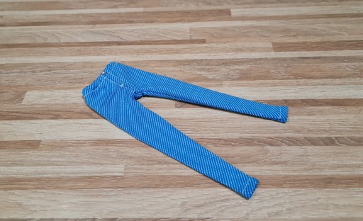 Przedmiotem sprzedaży jest ubranko dla lalki. Spodnie rurki dla lalek z plastikowymi nogami na gumce. Uszyte z niebieskiej dzianiny w wyraźny splot jeansowy. Ozdobione srebrnym koralikiem.