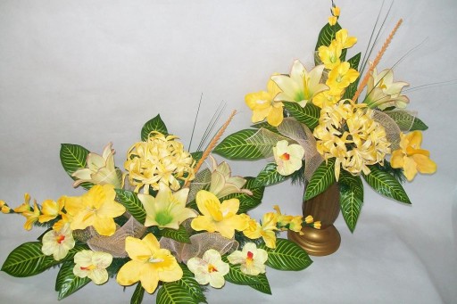 Kompozycja na grób (tzw. stroik, ikebana) jest wykonana na sztucznej chonie która jest zabetonowana w doniczce plastikowej okrągłej o średnicy 12 cm od dołu i 16 cm od góry i wysokości 7 cm.