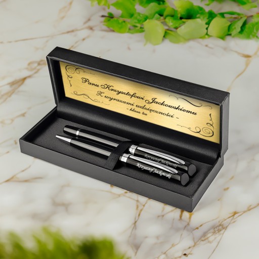 Cena zawiera również koszt laminowanej tabliczki z grawerem oraz grawera na dwóch częściach zestawu - piórze i długopisie.