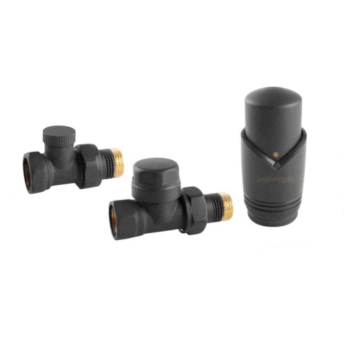Kompletny zestaw termostatyczny prosty w kolorze antracytowym. Idealnie sprawdzi się do nowoczesnych grzejników oraz grzejników dekoracyjnych.