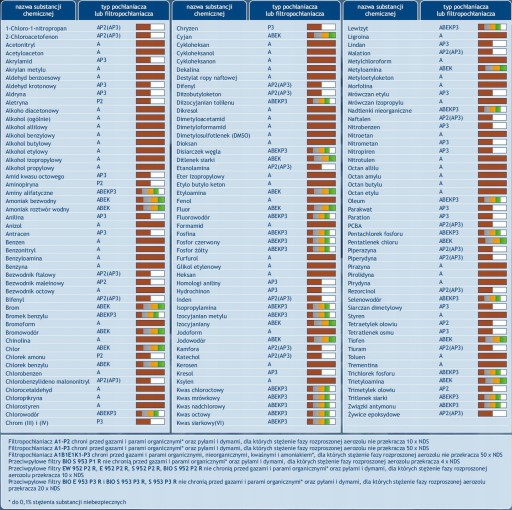 - A (brązowe) - Opary organiczne, rozpuszczalniki o punkcie wrzenia > 65℃