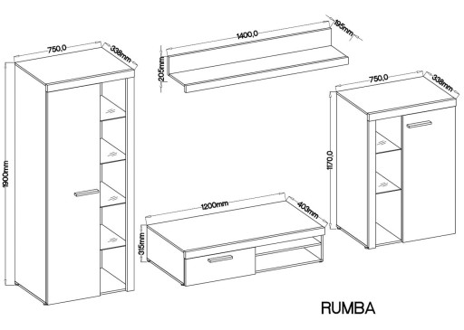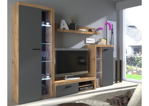 Meblościanka RUMB to zbiór czterech samodzielnych brył, które razem tworzą niezwykle funkcjonalny zestaw mebli. Komplet ten dostępny jest w nowoczesnej kolorystyce Garfit+ Dąb Lekas, która nada pomieszczeniu przytulnego charakteru. Meblościanka z kolekcji RUMB stanowi świetną bazę do stworzenia fantastycznej aranżacji pokoju dziennego.Możliwość dokupienia oświetlenia do mebli. Cena nie zawiera komody bocznej widocznej na drugim zdjęciu.Możliwość jej dokupienia jest w naszym sklepie.