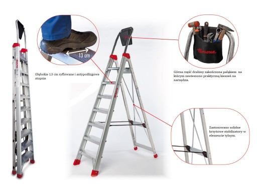 - Drabina jest wyposażona w wygodną i solidną kieszeń na narzędzia.