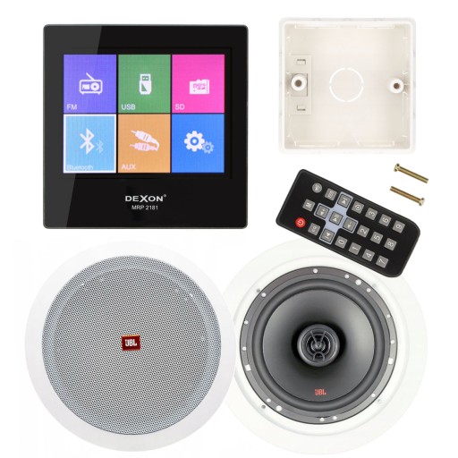 Ważną funkcją zestawu jest również możliwość odtwarzania dźwięku z urządzeń zewnętrznych poprzez wejście USB i kart Mikro SD (formaty plików audio: MP3, WMA, WAV, AAC i FLAC.) lub bezprzewodowo za pomocą BLUETOOTH. Niewielkie wymiary oraz dodatkowo możliwość wyboru urządzenia w dwóch wersjach kolorystycznych(biały lub czarny) pozwala łatwo wkomponować urządzenie w wystrój mieszkań, pomieszczeń biurowych, hotelowych, restauracji itp. Bardzo prosty montaż urządzenia wystarczy podłączyć tylko zasilanie 230 V, głośniki i antenę radiową. Dopełnieniem zestawu stanowią wodoodporne 6,5” dwudrożne okrągłe głośniki sufitowe o mocy 2x 40W firmy JBL. Głośniki o legendarnym brzmieniu będące solidnym i ekonomicznym uaktualnieniem dostarczanych urządzeń fabrycznych. Membrana stożkowa woofera z polipropylenu zapewnia imponujące wrażenia odsłuchu z doskonałymi niskimi tonami oraz czystym brzmieniem tonów średnich. Woofer doskonale uzupełnia się ze zbalansowanym tweeterem PEI, który dostarcza najwyższej jakości wysokie częstotliwości. Dołączone do zestawu śruby montażowe zapewniają łatwą i szybką instalację.