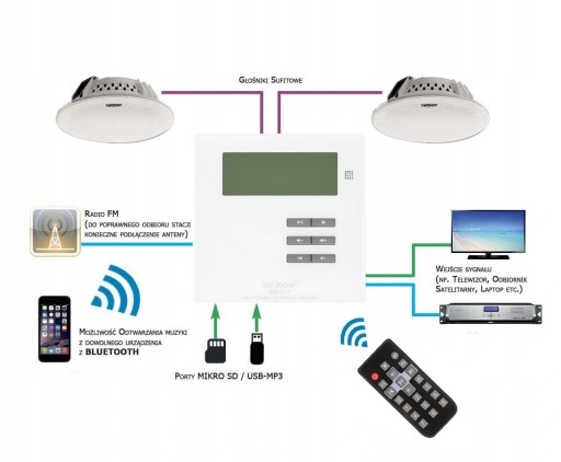 Ważną funkcją zestawu jest również możliwość odtwarzania dźwięku z urządzeń zewnętrznych poprzez wejście USB i kart Mikro SD (formaty plików audio: MP3, WMA, WAV, AAC i FLAC.) lub bezprzewodowo za pomocą BLUETOOTH. Niewielkie wymiary urządzenia pozwala łatwo wkomponować urządzenie w wystrój mieszkań, pomieszczeń biurowych, hotelowych, restauracji itp. Bardzo prosty montaż urządzenia wystarczy podłączyć tylko zasilanie 230 V, głośniki i antenę radiową. Dopełnieniem zestawu stanowią wysokiej jakości głośniki natynkowe o mocy 20W. Wyposażone są w transformator, co pozwala na zastosowanie ich również w instalacjach 100V. Estetyczny, klasyczny design, a także dostępność dwóch wersji kolorystycznych (białej i czarnej) powodują, że głośniki doskonale sprawdzą się przy wszelkiego rodzaju nagłośnieniach - od domu czy mieszkania, przez sklep, salon urody, kawiarnię i restaurację, aż po duże obiekty, np. hotele.