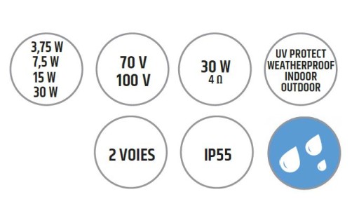 Dopełnieniem zestawu stanowią dwudrożne wodoodporne głośniki naścienny o mocy 2x 40W firmy Rondson przeznaczone do nagłośnień wewnętrznych i zewnętrznych. Wodoodporność zapewnia obudowa wykonana z ABS oraz aluminiowa kratka odporna na promieniowania UV. Kształt oraz obudowa głośnika zapewniają doskonałe tłumienie, długą żywotność oraz czysty i wyraźny dźwięk. Selektor wyboru mocy umieszczony z tyłu obudowy głośnika. Dzięki wbudowanemu transformatorowi sprawdzi się w instalacjach 100V, ale także niskoimpedancyjnych.