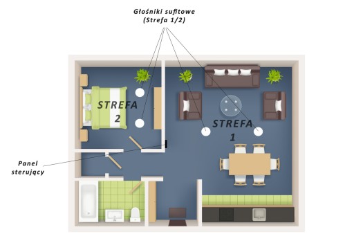 Dodatkową zaletą systemu jest możliwość nagłośnienia przy pomocy jednego urządzania dwóch pomieszczeń i stworzenie w ten sposób 2 niezależnych stref dźwięku na zasadzie multiroom. Dzięki takiemu rozwiązaniu mamy możliwość odtwarzania jednocześnie dźwięku z różnych źródeł w dwóch pomieszczeniach w tym samym momencie(np. Strefa 1 - Radio internetowe, Strefa 2 - Bluetooth). Zastosowany wzmacniacz daje możliwość podłączenia do 4 głośników w 1 strefie. Regulacja głośności w każdej ze stref odbywa się niezależnie.