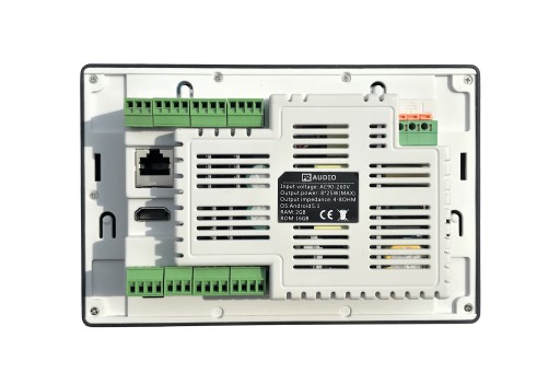Zestaw składa się m z panelu ściennego z jasnym 7" dotykowym podświetlanym wyświetlaczem do montażu podtynkowego z wbudowanym wzmacniaczem stereo klasy D o mocy 8 x 25W. Uzupełnieniem jest wbudowany odtwarzacz radia internetowego(z możliwością obsługi również za pomocą aplikacji TuneIn/Spotify dzięki, której w łatwy sposób można stworzyć własną listę ulubionych stacji radiowych) i wejście AUX do dodatkowych źródeł sygnału, wyjście na subwoofer aktywny, możliwość automatycznego odtwarzania wg. harmonogramu jak również praca w sieci bezprzewodowo za pomocą sieci WI-FI. Panel wyposażony jest w system operacyjny Android i posiada fabrycznie zainstalowane m.in. Spotify, Youtube Vanced, RadioBox, VLC Media Player, Aptoide, Google Chrome etc. Urządzenie wspiera protokoły DLNA / UPnP, QPlay i AirPlay za możliwością obsługi urządzenia za pomocą aplikacji Eshare oraz iMirror zainstalowanej na telefonie lub teblecie.