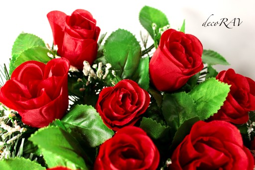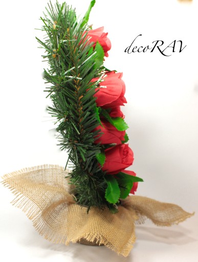 Dekoracja na metalowym stelażu wypełniona wężem z folii choinkowej, udekorowana czerwonymi różami w ilości 14 sztuk.
