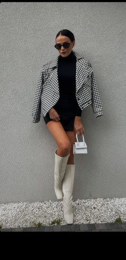 Krótka narzutka w kratkę z podszewką. Zapinana na napy, długi rękaw zakończony mankietem z guzikiem.