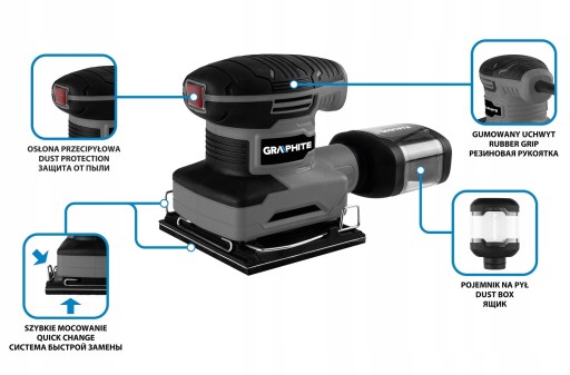 Szlifierka oscylacyjna 240 W, stopa 110 x 100 mm 59G322 GRAPHITE to narzędzie do wygładzania oraz polerowania powierzchni na sucho. Kompatybilne do obróbki i oczyszczania powierzchni o zróżnicowanej twardości oraz strukturze.