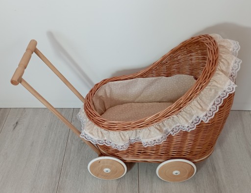 Drewniane kółka pozwalają z łatwością jeździć wózkowi, a wiklinowa rączka pozwala swobodnie pchać wózek. Piękny i modny wiklinowy wózek dla lalek. Spełnienie marzeń każdej młodej damy.