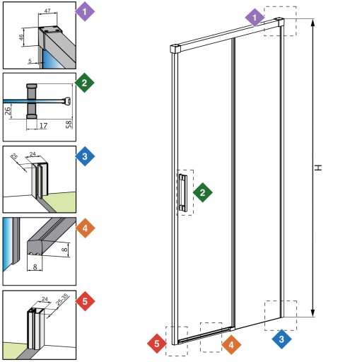 - Stabilna konstrukcja - stabilną konstrukcję kabiny gwarantuje solidny stabilizator górny zintegrowany z torem przesuwu drzwi oraz boczne profile instalacyjne.