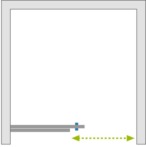 - Drzwi posiadają mechanizm przesuwu oparty na torze górnym. Szerokość wejścia do wnętrza prysznica po całkowitym rozsunięciu skrzydła wynosi: 690 mm